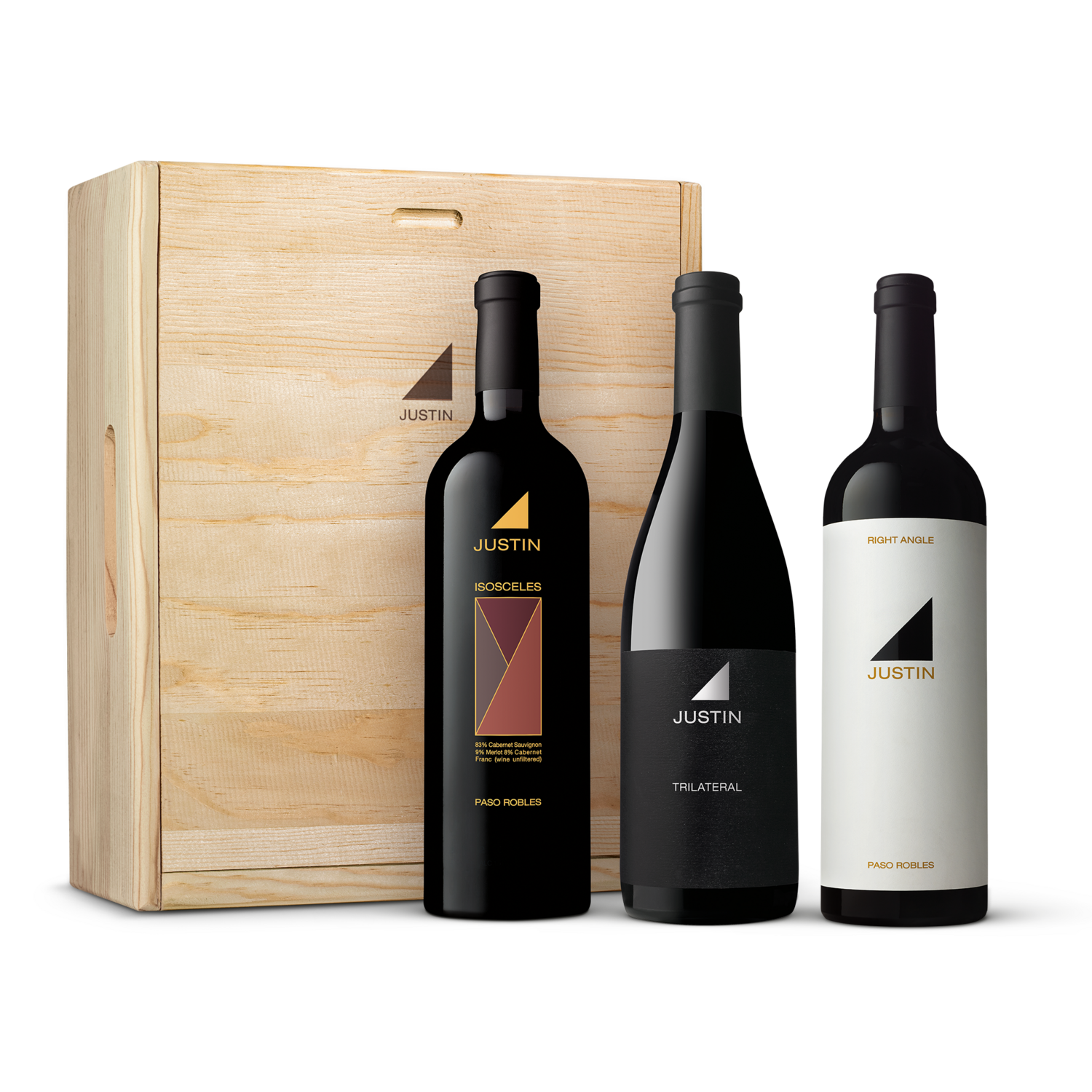 Looking for the perfect triangulation of exceptional wine? Look no further. Our TRIANGLE Collection comes with three of our most expressive 750mL bottles: ISOSCELES, our flagship wine that put us on the map, TRILATERAL, a French Rhône-style blend with a JUSTIN twist, and RIGHT ANGLE, an eclectic blend that’s pure Paso Robles.